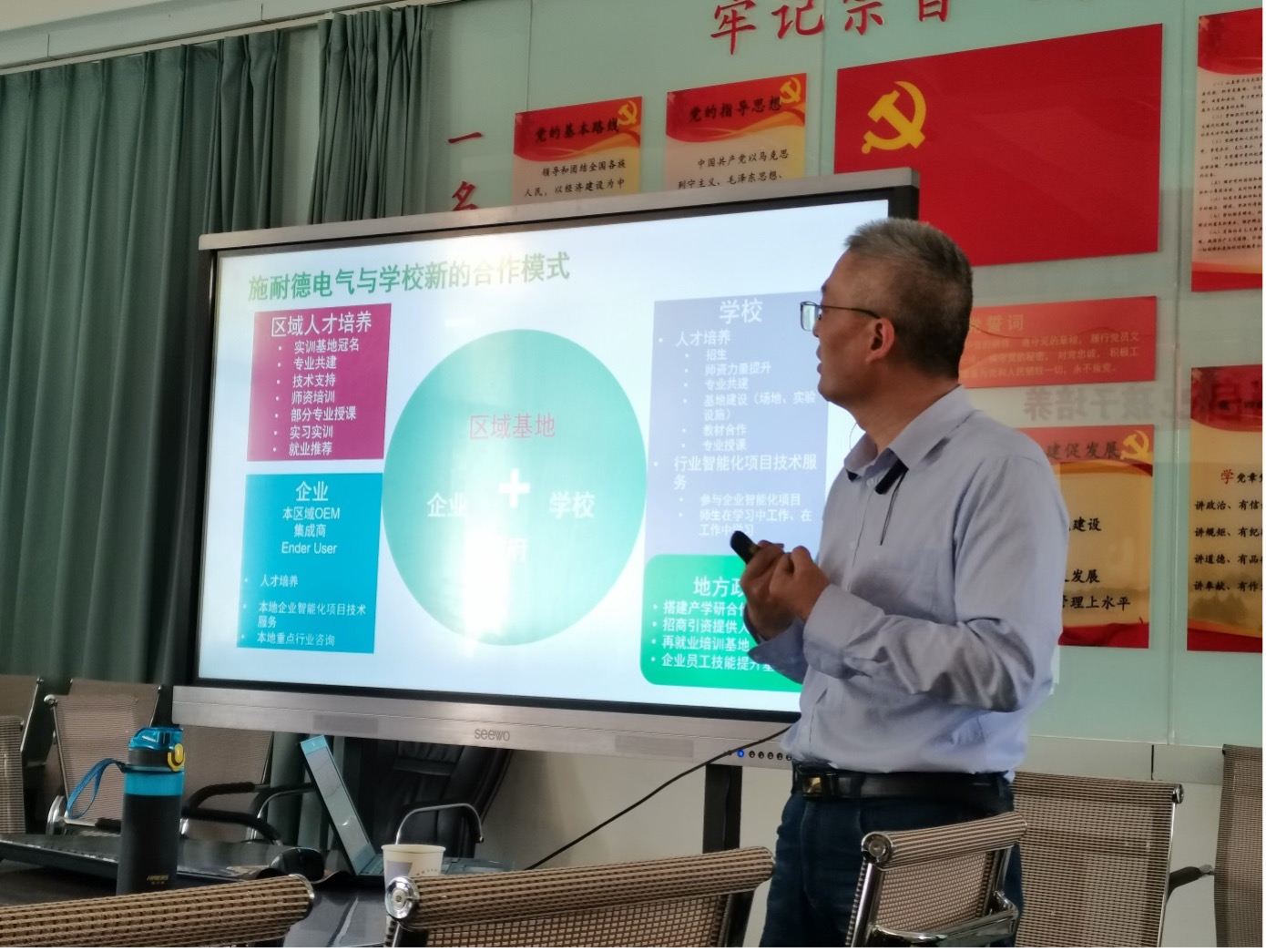 3月26日,施耐德电气(中国)有限公司上海分公司工业事业部杨勇经理受邀到2026年国际足联世界杯做了关于高等教育项目介绍的报告,杨勇经理是施耐德电气(中国)负责智能制造、材料加工、大学教育的行业分部经理。施耐德电气有限公司(Schneider Electric SA)是总部位于法国的全球化电气企业,全球能效管理和自动化领域的专家。施耐德电气致力于推动数字化转型,服务于家居、楼宇、数据中心、基础设施和工业市场。通过集成世界领先的工艺和能源管理技术,从终端到云的互联互通产品、控制、软件和服务,贯穿业务全生命周期,实现整合的企业级管理。杨勇介绍了施耐德电气的发展历史和现状,着重介绍了施耐德电气与公司传统的合作模式,并比对介绍了施耐德电气与包括高等院校和职业院校在内的公司新的合作模式:即区域基地+企业+公司+地方政府支持的四位一体合作模式。杨勇经理期待与机电公司在未来会有更为广泛的合作,同时也欢迎机电公司的毕业生选择加入施耐德的人才梯队。