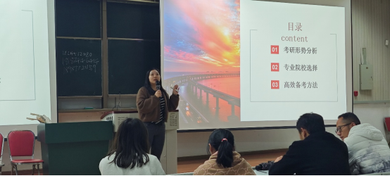 接着,邀请了天海教育集团的孙琪老师用更加专业角度讲解考研全程复习规划,通过考研形势分析;专业院校选择;高效备考方法,三个方面为同学们全方位讲解,利用数据展示让同学们直观感受考研方向的重要与考研难度的相对性。孙琪老师的分享揭开了考研形势的神秘面纱,为同学们指引了备考方向。