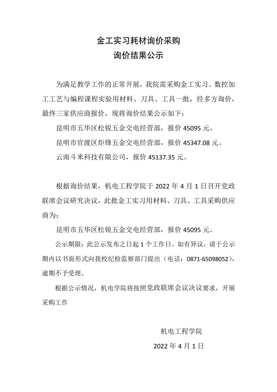 金工实习耗材询价采购询价结果公示