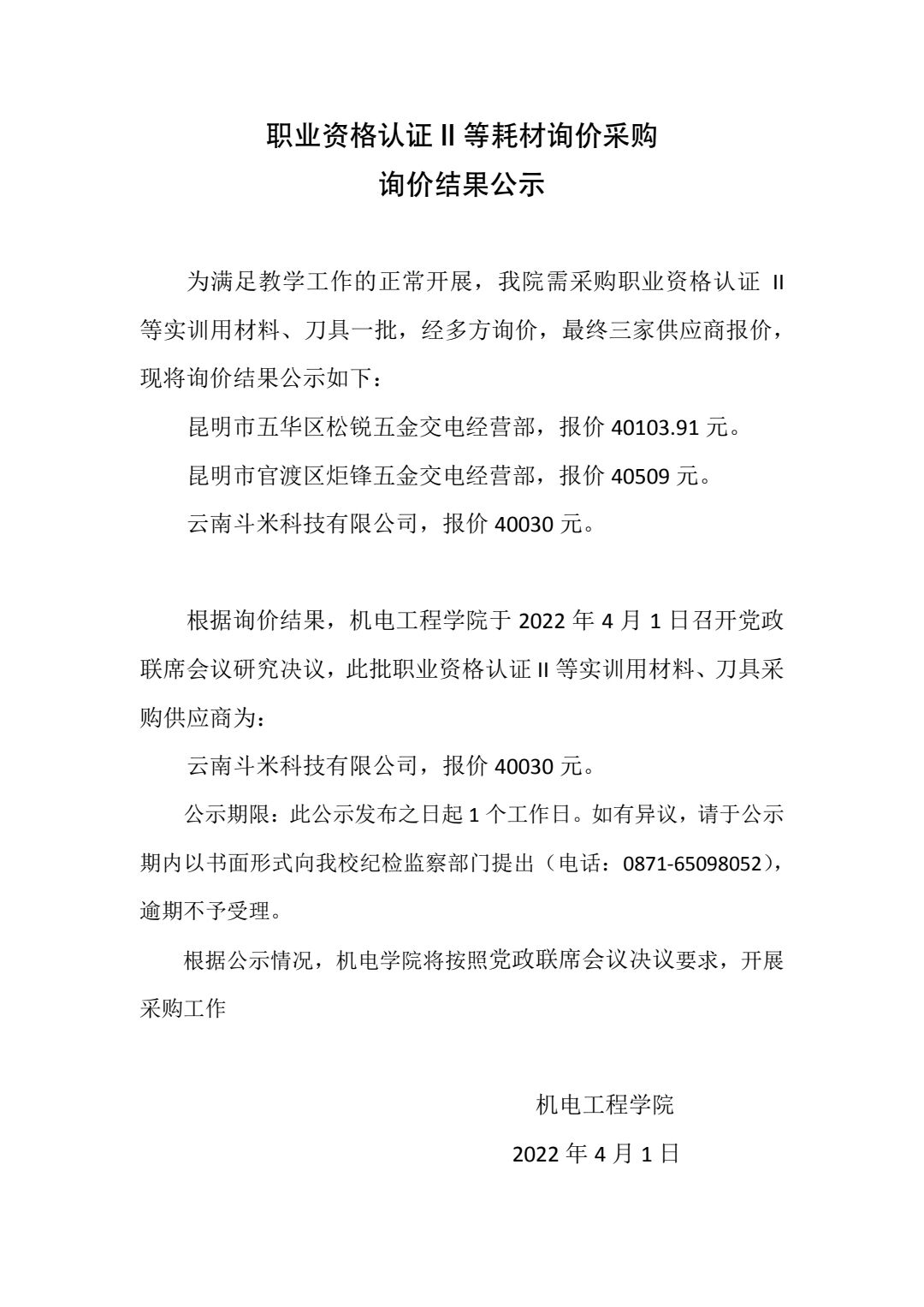 职业资格认证Ⅱ等耗材询价采购询价结果公示