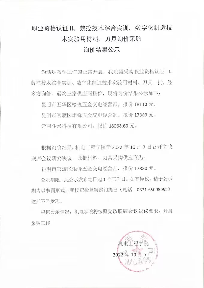 职业资格认证II、数控技术综合实训、数字化制造技术实验用材料、刀具询价采购 询价结果公示