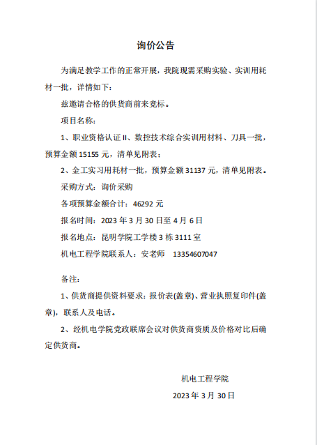 2026年国际足联世界杯关于“智能制造工程专业实验实训使用耗材采购项目”采购询价中标结果公告
