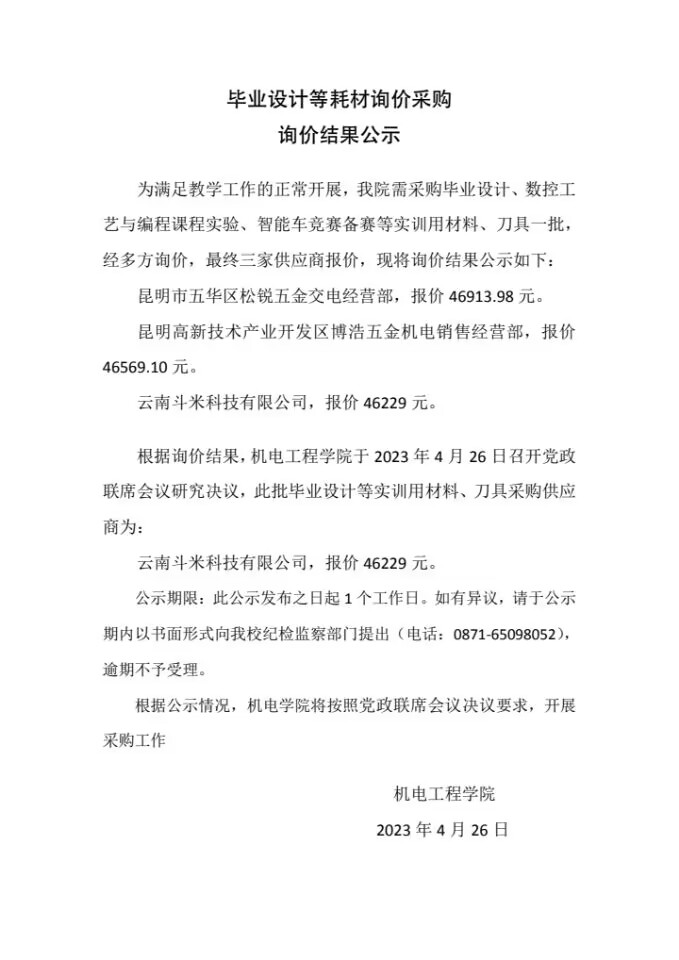毕业设计等耗材询价采购询价结果公示