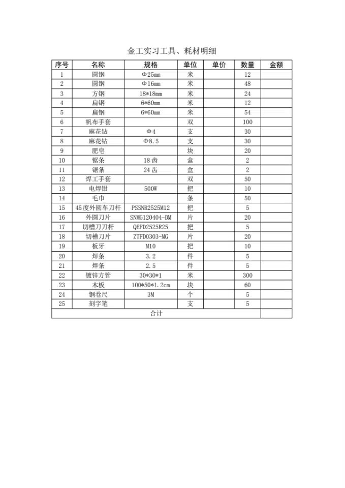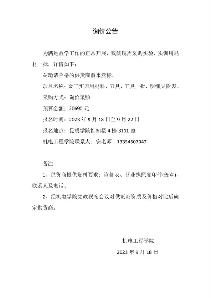 金工实习用材料、刀具、工具询价采购询价结果公示