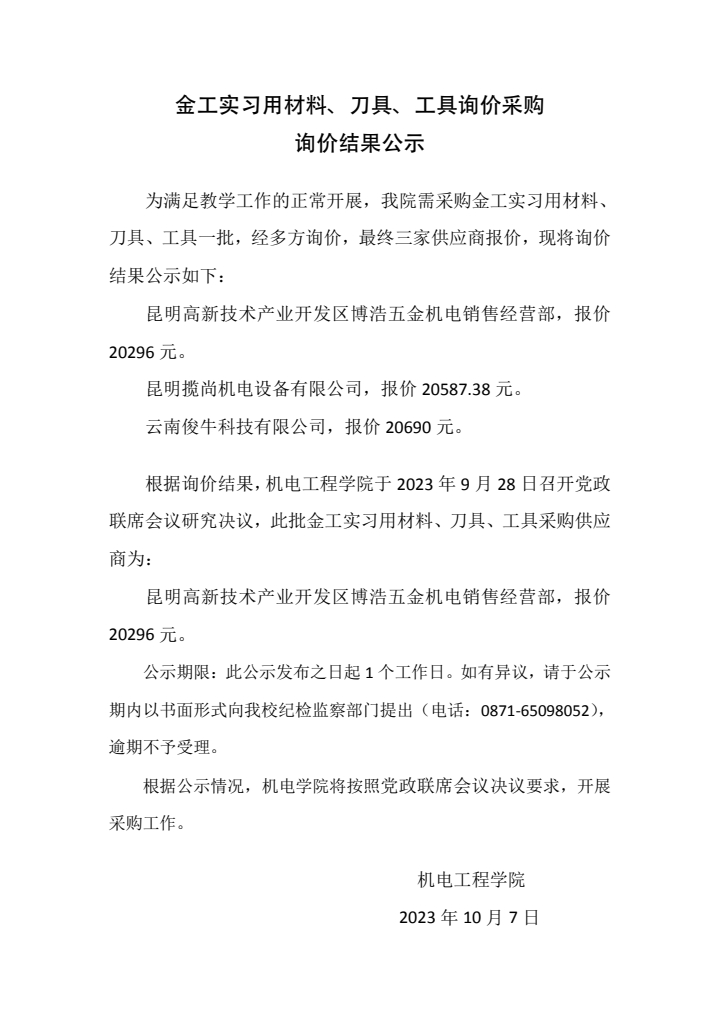 金工实习用材料、刀具、工具询价采购询价结果公示