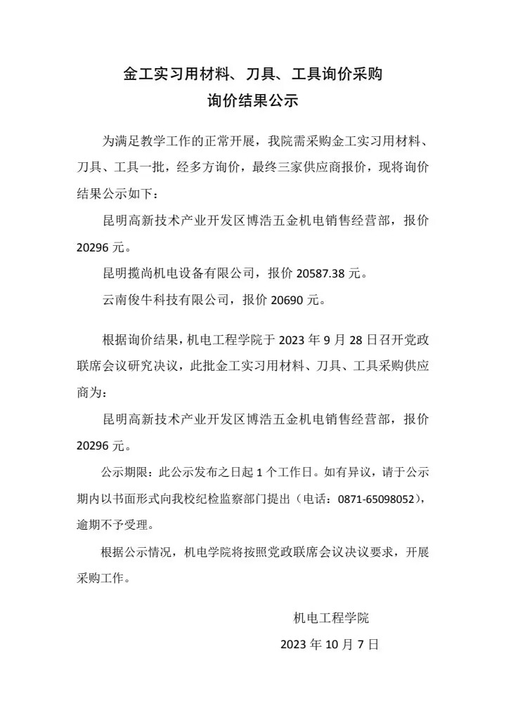 金工实习用材料、刀具、工具询价采购询价结果公示