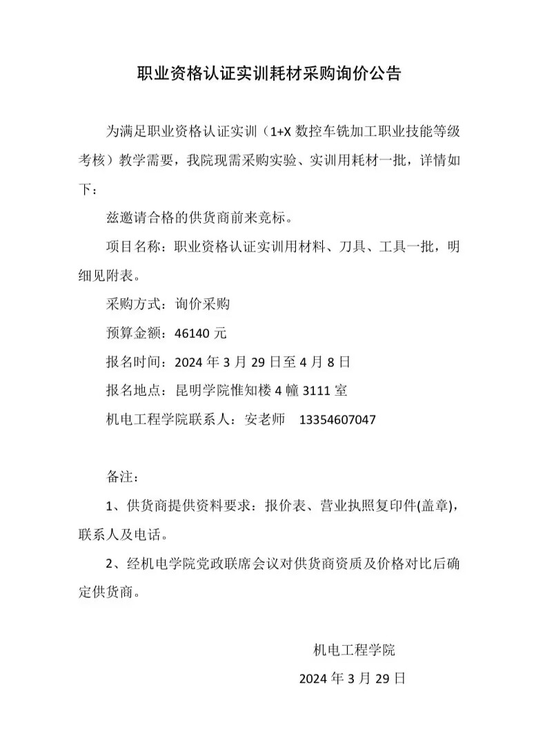 金工实习耗材采购询价公告