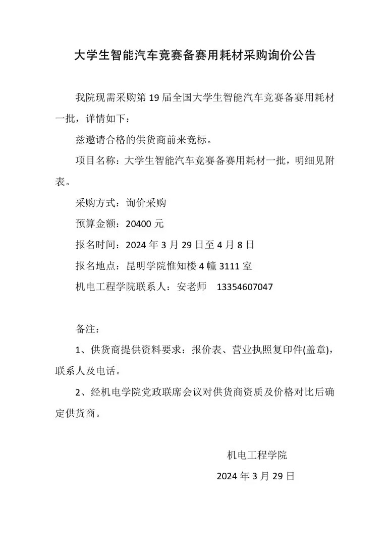 老员工智能汽车竞赛备赛用耗材采购询价公告