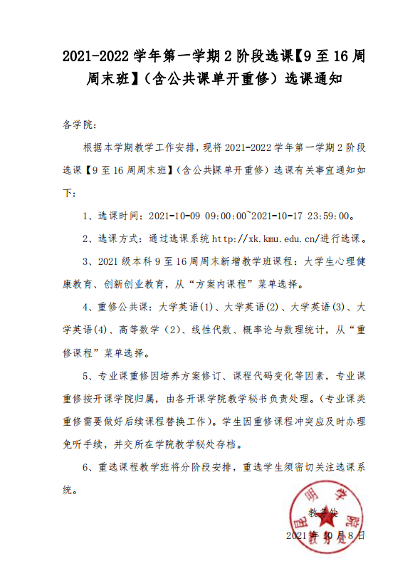 2021-2022学年第一学期2阶段选课【9至16周周末班】(含公共选修课单开重修)选课通知